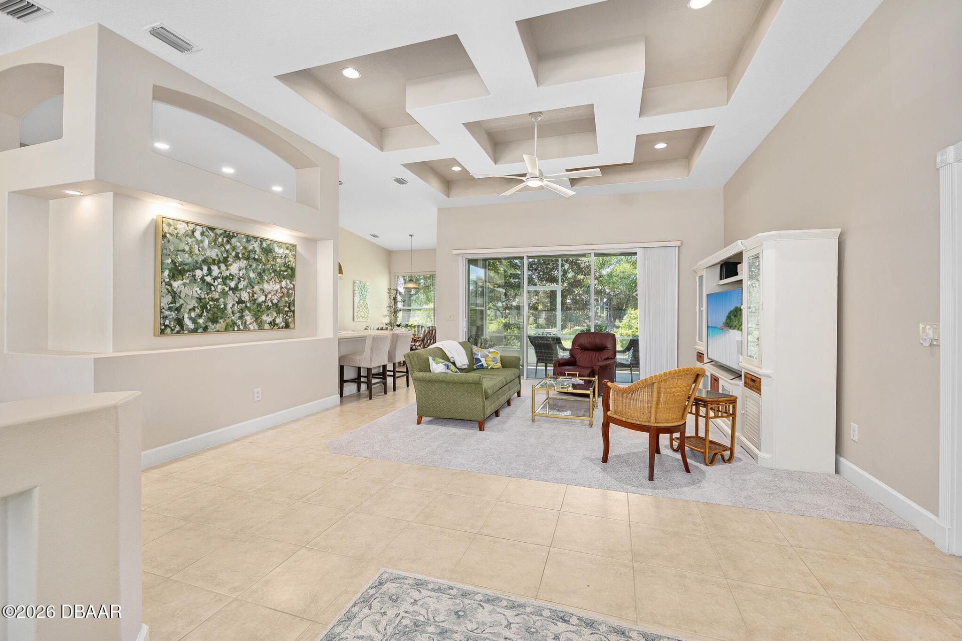 Beautifully maintained ICI Chatham model offering elegance and functionality! Enter through grand double doors into a light-filled home with neutral tones, custom niches, and a decorative knee wall. The living room features a stunning lighted two-tone coffered ceiling, creating a warm and inviting centerpiece. This split floor plan includes 3 bedrooms and 2 bathrooms, with one bath providing direct outdoor access--perfect for a future pool. Enjoy high ceilings, abundant storage, a formal dining room, and an eat-in kitchen with breakfast bar. The indoor laundry room includes upper cabinets and a utility sink. Relax on the screened lanai overlooking a landscaped, pool-ready backyard with sunset and fountain views. Located in a 24-hour manned gated community, with the home having its own security system included for peace of mind.